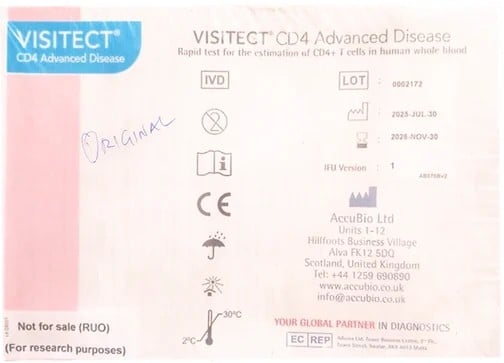 It said the genuine VISITECT CD4 Advanced Disease test kit is manufactured by AccuBio Ltd, Units 1–12, Hillfoots Business Village, Alva, FK12 5DQ, Scotland, United Kingdom, and marketed in Nigeria by Euro Specs International Nigeria Limited, with NAFDAC Registration Number A3-100-153.