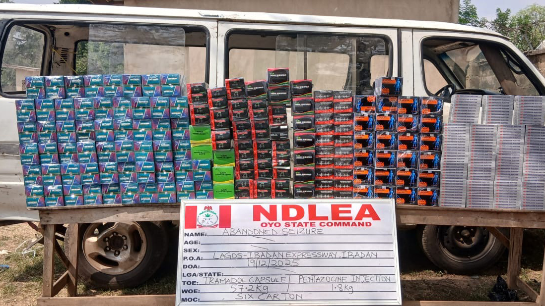 In Oyo State, operatives, same December 19, recovered 125,000 capsules of tramadol and 1,800 ampoules of pentazocine injection in a Toyota Hiace bus marked XD 592 AWL along Lagos/Ibadan expressway, while Ogunlade Kazeem, 54, and Adeleke Ismail, 30, were arrested with 185.4 kilogrammes of skunk at Challenge Motor Park, Ibadan, on December 17.