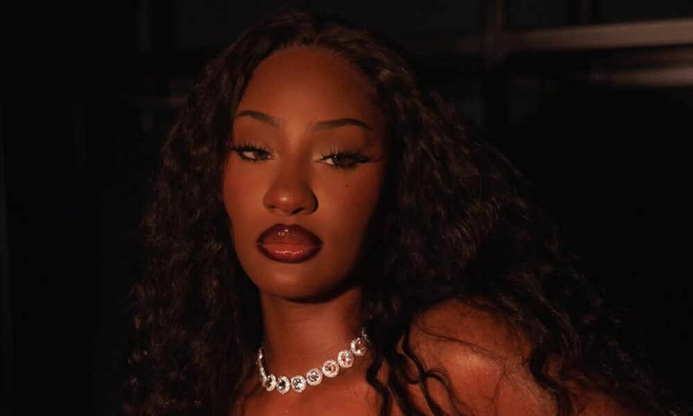 A close-up portrait of Tems wearing a monochromatic polka dot dress with a high, ruched neckline. She is wearing small silver hoop earrings and her hair is styled in a structured updo. Photo Credit: Tems/Instagram